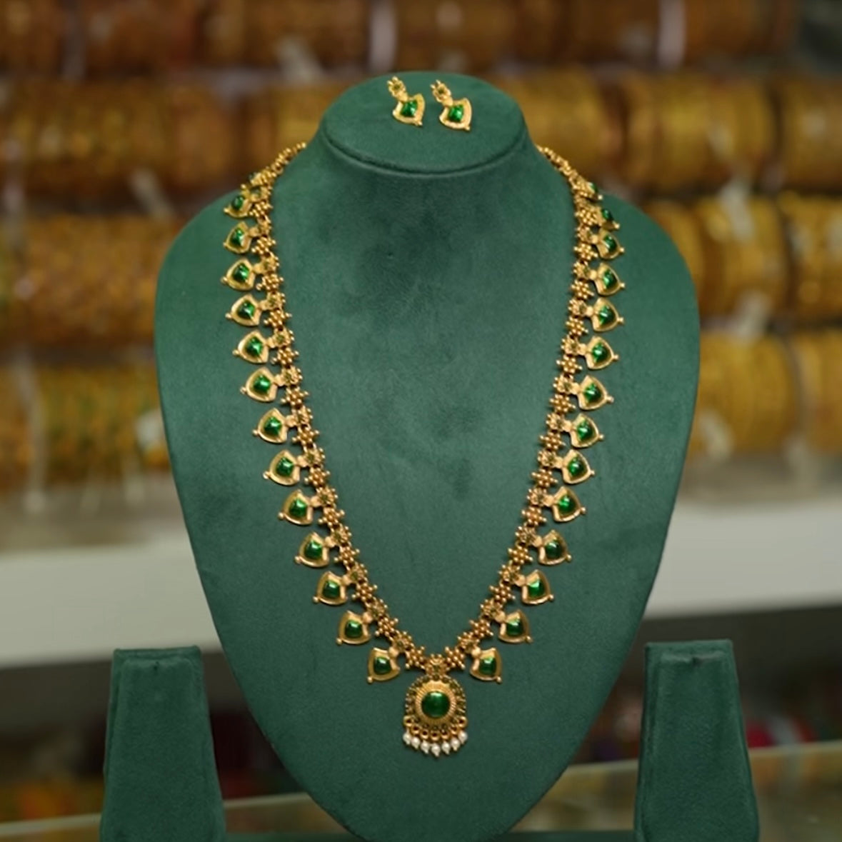 Elevate your traditional style with this exquisite Antique Palakka Long Chain, featuring timeless Palakka glass stones set in antique gold-finish detailing. Perfect for pairing with ethnic wear, this handcrafted piece adds a touch of vintage charm and elegance to any festive or ceremonial look. A must-have for lovers of classic South Indian jewelry.